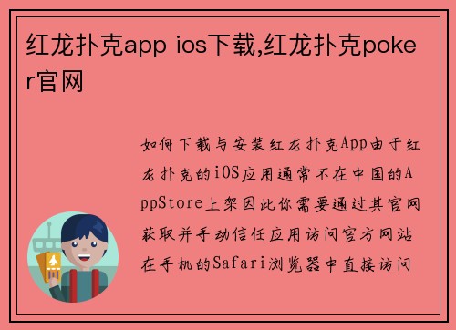 如何下载红龙扑克APP 你可以参考以下步骤,通过官方渠道下载红龙扑克APP: * 安卓设备:通常可以直接在提供的官方下载页面上点击【立即下载】按钮,获取安装文件。如果遇到下载无响应的情况,可以尝试点击页面上提供的备用下载地址。 * 苹果设备:苹果手机的下载步骤稍微复杂一些,具体如下: 1. 使用S...